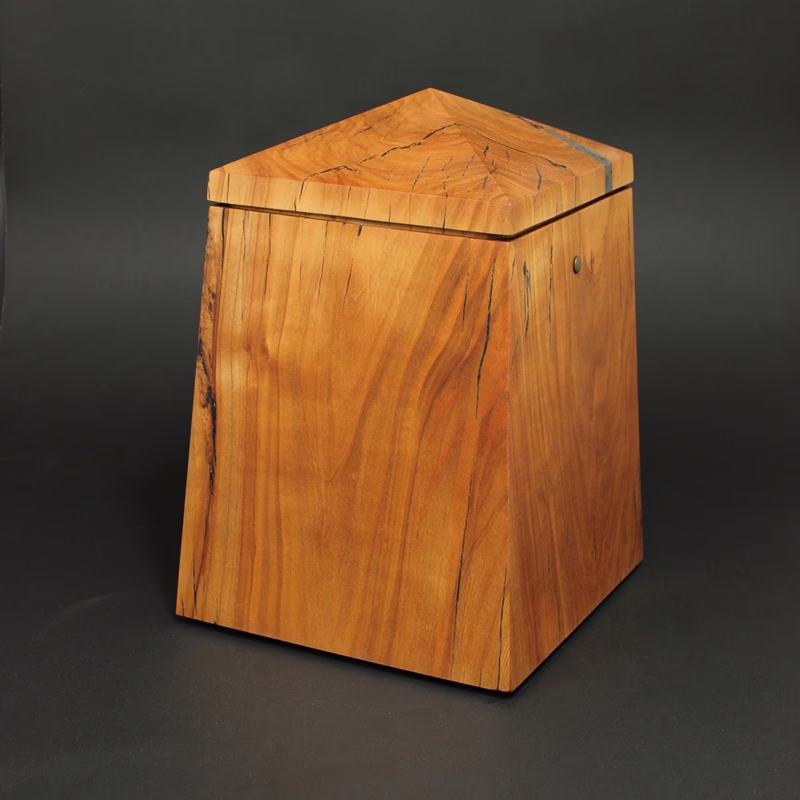 Elegant gestaltete Holzurne in Obeliskform mit sich zur Oberseite verjüngender Form und Turmdach.