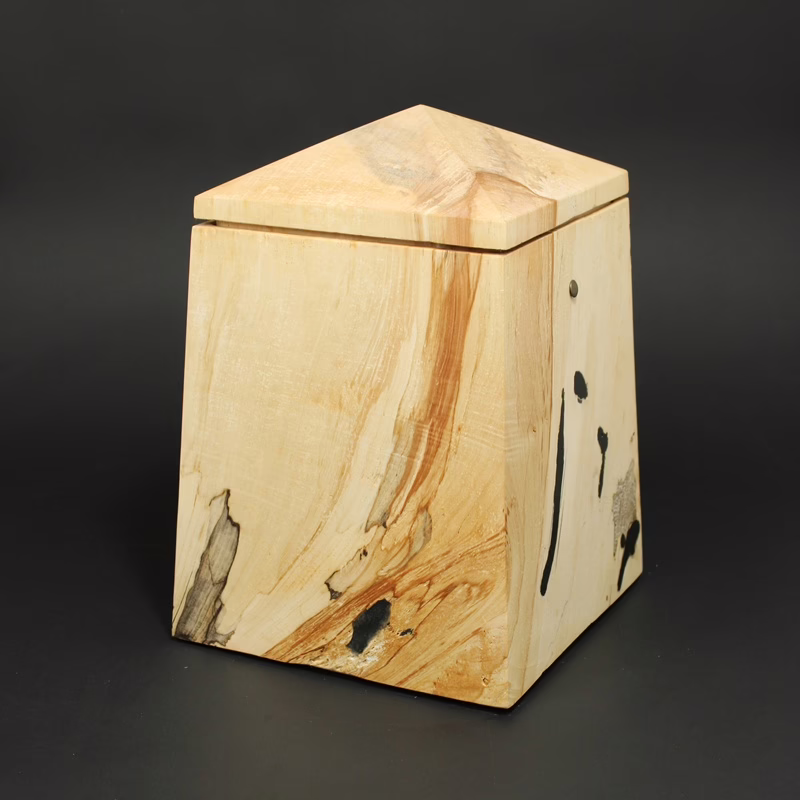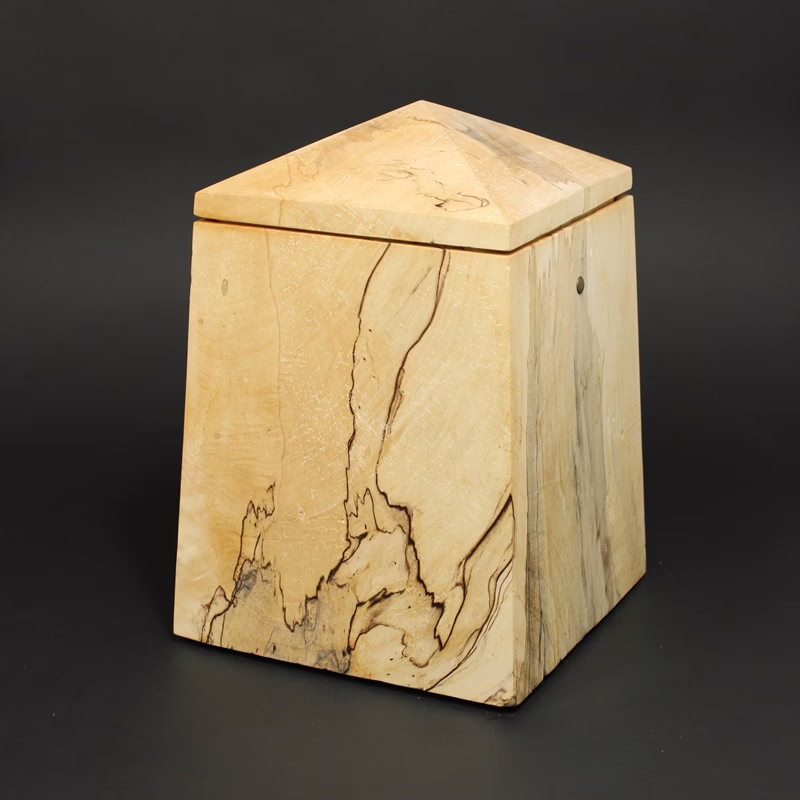 Elegant gestaltete Holzurne in Obeliskform mit sich zur Oberseite verjüngender Form und Turmdach.