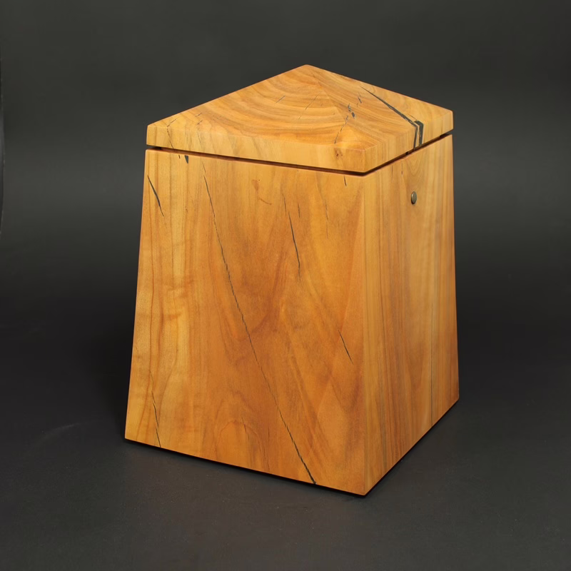 Elegant gestaltete Holzurne in Obeliskform mit sich zur Oberseite verjüngender Form und Turmdach.