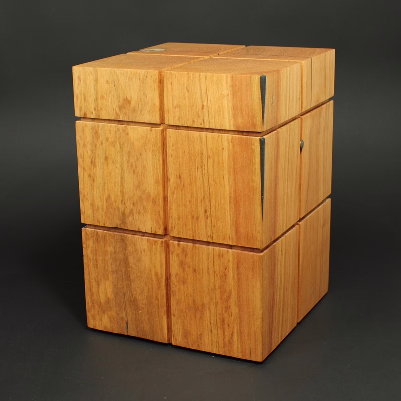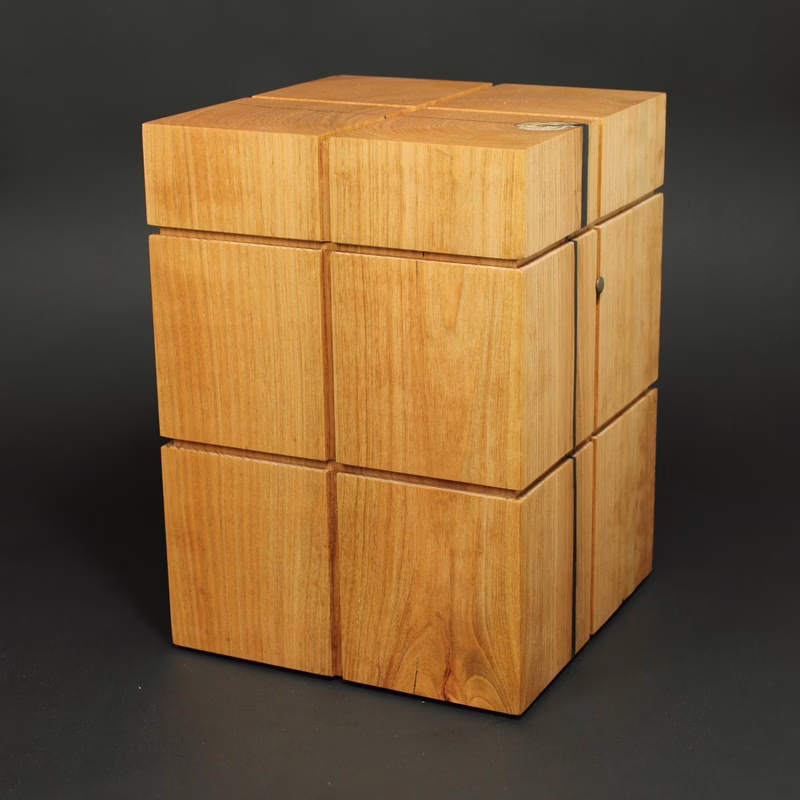 Minimalistisch und modern gestaltete Holzurne in kubischer Form mit klarer und ruhiger Linienführung.