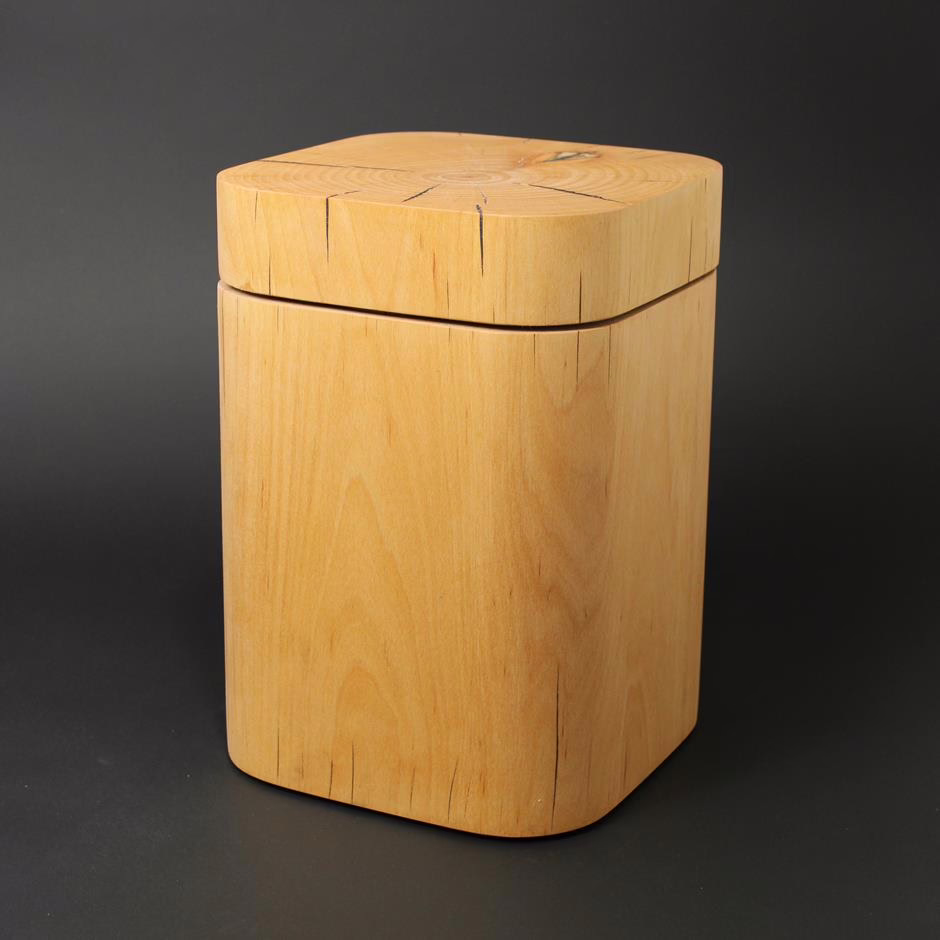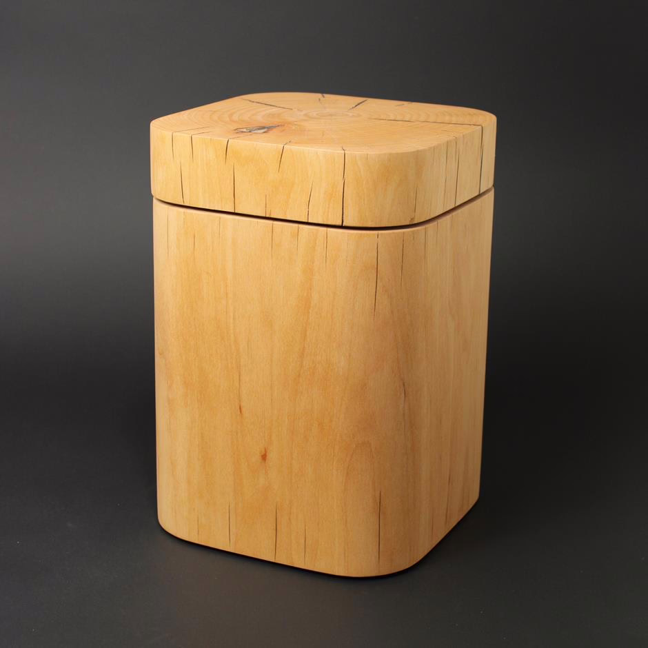 Geradlinig gestaltete Holzurne mit sanften, in großem Radius abgerundeten Ecken.