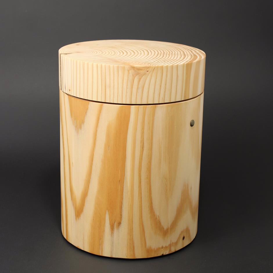 Zylinderförmig gestaltete Holzurne mit sehr gerader Linienführung.