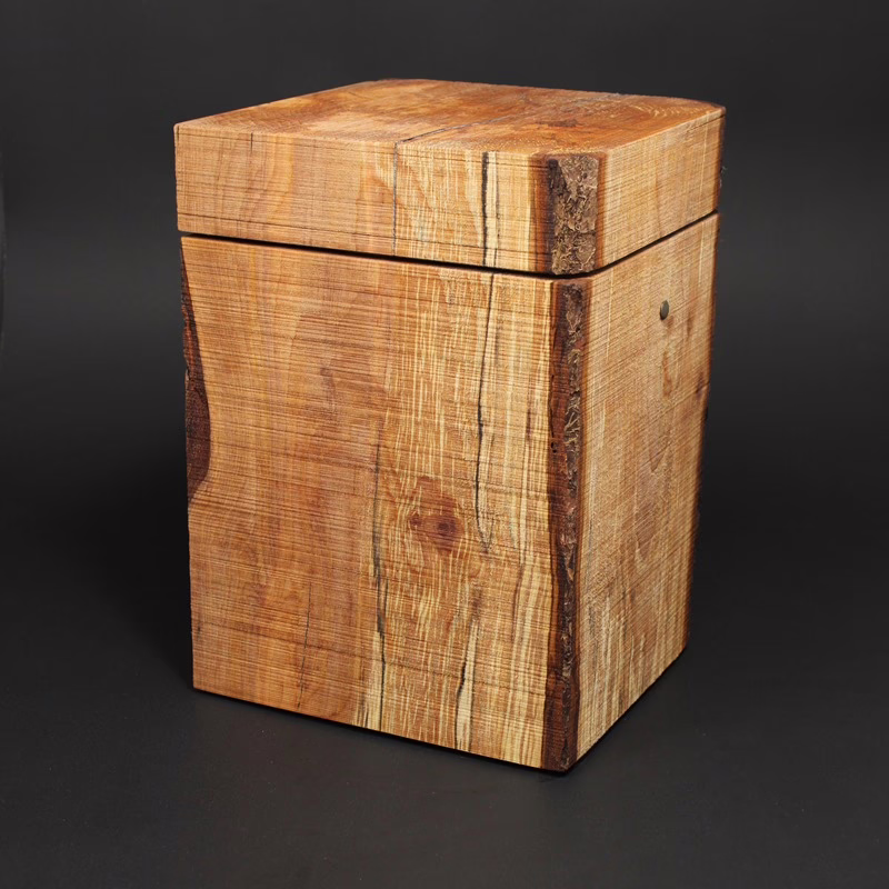 Puristisch und ursprünglich gestaltete Holzurne in Quaderform mit 1-2 Waldkanten und sägerauer Oberfläche.